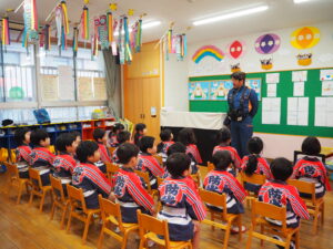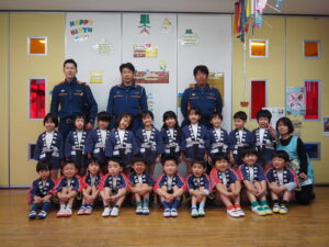 4月23日(木)、消防署の方々に月出保育園へお越しいただき、つき組さんの幼年消防団結成式が行われました🚒✨