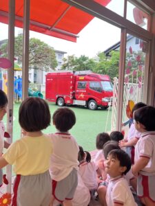 窓から見える消防車に「かっこいいね!」「大きいね!」とワクワクした様子で見つめる姿が見られました♪