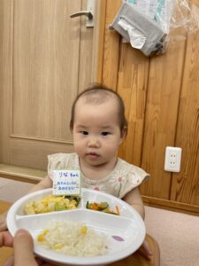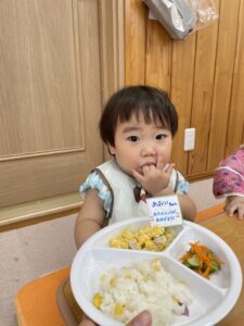 コーン飯、やみつきチキン、卵焼き、ポテトサラダ、りんごでした!