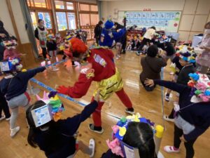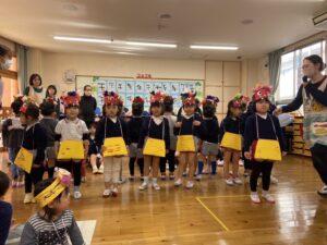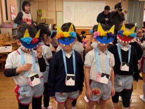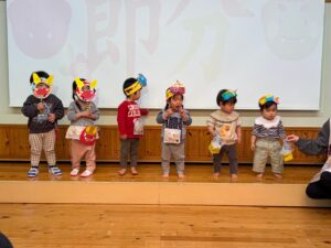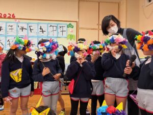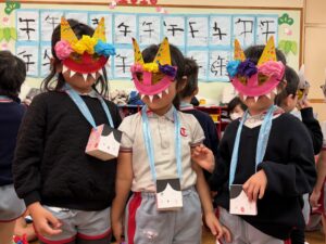 みんなが一生懸命作ったお面と豆入れのお披露目会‼