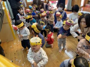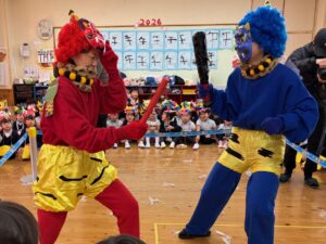 鬼の的や鬼に向かって豆を投げ、「泣き虫おに」や「怒りんぼおに」などを